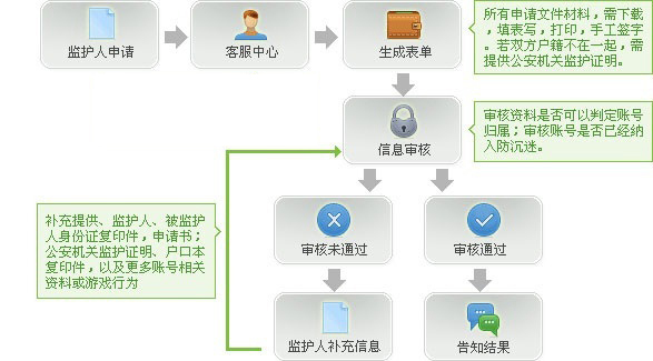 家长监护系统充分考虑家长的实际需求,当家长发现自己的孩子玩游戏过于沉迷的时候,由家长提供合法的监护人资质证明、游戏名称账号、以及家长对于限制强度的愿望等信息,可对处于孩子游戏沉迷状态的账号采取几种限制措施,解决未成年人沉迷网游的不良现象,如限制孩子每天玩游戏的时间区间和长度,也可以限制只有周末才可以游戏,或者完全禁止。